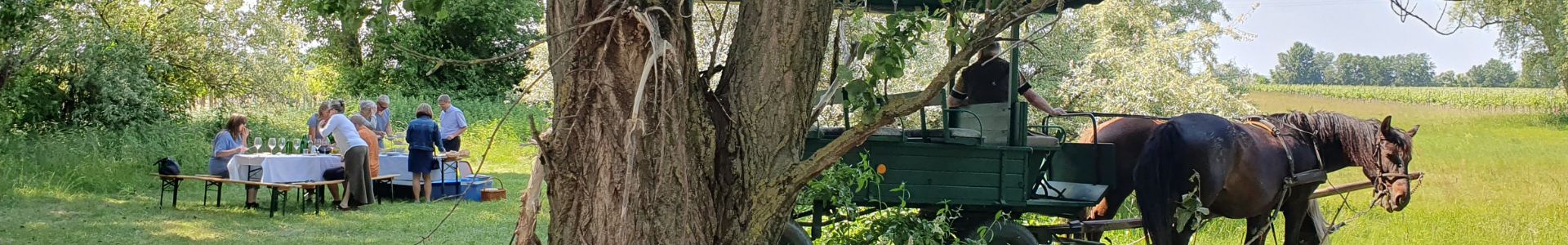 Im Gebiet der Seeweingärten, beim Seewäldchen hält die Kutsche an einem idyllisch gelegenen Platz, wo uns bereits ein Picknick in Form eines großzügigen Buffets, das keine Wünsche offen lässt, erwartet.